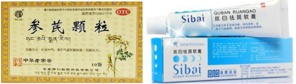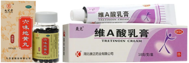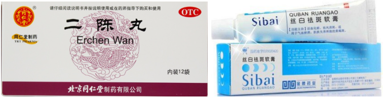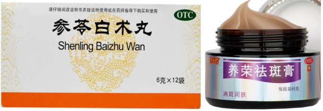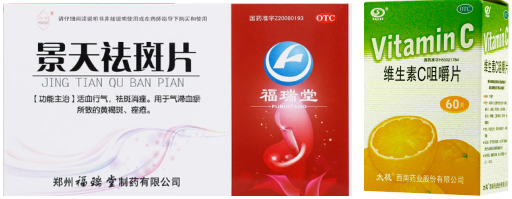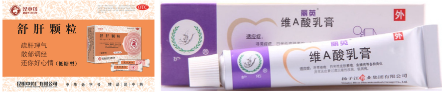 现在位置: 首页 / 销售 / 正文 黄褐斑的10个联合用药方案 yaoyao 销售 2023-11-14 2热度 0评论 黄褐斑是一种发生于颜面的色素增生性皮肤病,多发于青年女性,其发病率有逐年增大的趋势。 皮损部以面部两颊为最常见,表现为淡褐色或深褐色的不规则斑片,不痛不痒,困扰大多女性。 01 黄褐斑概述 其发病原因和机理复杂,目前尚未完全明了。发病原因可能与遗传因素、日光照射、妊娠、服用药物(长期服用冬眠灵、苯妥英钠、安体舒通等药物)、慢性疾病(慢性酒精中毒、结核、月经不调、痛经、子宫附件炎、不孕症等)、应用化妆品不当、皮肤的微生态失衡、饮食因素等等因素有关。 西药一般采用全身治疗(维生素类、谷胱甘肽与维生素C并用、儿茶素等)和局部外用治疗(氢鲲、壬二酸、维A酸、酚硫醚等)方法来治疗黄褐斑。 而在中医中,黄褐斑被称之为“肝斑”、“黎黑斑”。其与肝、脾、肾有关,故中药内治一般采用调理肝、脾、肾以达到治疗黄褐斑的目的。 中医中,黄褐斑常被分为4种证型,不同证型用药不同,我们一一来看。 02 证型一:肝郁气滞型 1、症状表现 两颊部皮损为浅褐色斑片,大小不一,伴烦躁易怒,胁肋胀痛,情志抑郁;月经先后无定期,经色暗紫,经前乳胀,舌质暗红,苔薄黄,脉弦。 2、对证治法 疏肝理气,解郁调经。 3、联合方案 ①红花逍遥片+氢醌乳膏+维生素C片 红花逍遥片舒肝、理气、活血,可用于肝气不舒,胸胁胀痛,头晕目眩,月经不调,乳房胀痛或伴见颜面黄褐斑; 氢醌乳膏通过抑制酪氨酸转化酶氧化作用,和抑制其他的黑色素细胞代谢过程而产生可逆性的皮肤褪色,适应黄褐斑的治疗; 维生素C可通过减少酯类物质而抑制黑色素产生,可能与其对黑色素形成的多个氧化步骤的抑制作用有关,并且其能使皮肤中已形成的黑色素还原为无色物质或使黑色素转化为水溶性的胶原物质,从而达到祛斑、增白的功效,适用于黄褐斑。 ②逍遥丸+青鹏软膏 逍遥丸疏肝健脾、养血调经。可用于肝气不舒所致的月经不调、胸胁胀痛、头晕目眩,适用于肝郁气滞型黄褐斑; 青鹏软膏外用可以清泻肝脾肾脏内热,活血理气,化瘀消斑,达到消除色斑皮损作用 。 ③舒肝颗粒+维A酸乳膏 舒肝颗粒舒肝理气,散郁调经。用于肝气不舒的两胁疼痛,胸腹胀闷,月经不调,头痛目眩,心烦意乱,口苦咽干,以及肝郁气滞所致的面部黧黑斑(黄褐斑)。 维A酸可调节黑素生成与转运,同时,维A酸能使角质形成细胞间粘着度下降、含黑素颗粒的角质形成细胞更新加速,减少了角质形成细胞和黑素细胞的接触时间,并且通过表皮更新促使黑素的快速丢失。 03 证型二:脾虚湿蕴型 1、症状表现 皮损呈黄褐色斑片,边缘欠清楚,面色少华或萎黄,胸脘痞闷,神疲嗜睡,乏力,纳呆,月经后期,经血色淡,舌淡苔白,边有齿痕,脉细。 2、对证治法 健脾利湿,活血养血。 3、联合方案 ①参苓白术丸+维生素C片+维生素E胶丸+养荣祛斑膏 参苓白术丸以益气健脾,祛除湿气,培补后天,充养气血之源,从而达益气养血,泽润肌肤,荣养颜面之目的; 维生素C是一种抗强氧化剂,能使颜色较深的氧化型色素还原为色浅的还原型色素,从而抑制黑色素的形成; 维生素E可以加速血液循环,增强皮肤弹性,同时也具有抗氧化作用,与维生素C合用有协同作用; 养荣祛斑膏消斑润肤,用于面部黄褐斑的辅助治疗。 ②参苓白术丸+二陈丸+丝白祛斑软膏 参苓白术丸、二陈丸合用,标本兼顾,健脾理气和燥湿祛痰之力更甚,祛除痰湿,培补后天,充养气血之源,从而达荣养颜面之目的; 丝白祛斑软膏局部外用活血化瘀,祛风消斑,适用于肌肤失养所致的黄褐斑。 04 证型三:气滞血瘀证 1、症状表现 面部褐色斑,久病,色泽较深,舌质暗红,苔薄白,脉细涩。 2、对证治法 养血活血,化瘀消斑。 3、联合方案 ①景天祛斑片+维生素C咀嚼片+维生素E软胶囊 景天祛斑片活血行气,祛斑消痤,有净血功效,通过调节人体气质和体液,改善微循环及性激素失调所导致的皮肤炎症,调节异常的血液质、黏液质、胆液质、黑胆质功能,从而使皮肤微循环血液充沛、弹性增加,恢复肌肤细胞活力,可用于气滞血瘀所致的黄褐斑; 维生素C是抑制黑色素的形成;维生素E加速血液循环,增强皮肤弹性,同时也具有抗氧化作用。 ②调经祛斑胶囊(片)+维生素EC颗粒+氢醌乳膏 调经祛斑胶囊养血调经,祛瘀消斑,用于营血不足,气滞血瘀,月经过多,黄褐斑。尤其适用于月经不调的黄褐斑女性。 ③参芪颗粒+丝白祛斑软膏 参芪颗粒中山药、茯苓、赤芍、白芍、当归健脾养血活血; 益母草为调经活血化瘀之妇科要药,《普济方》记载其可“滋润面容”,均为美容良药;该药紧扣黄褐斑气滞血瘀之病机,补气活血、通经活络。 丝白祛斑软膏外用活血化瘀、祛风消斑,适用于气滞血瘀、肌肤失养所致的黄褐斑,外搽可使药物直达病所。 05 证型四:肝肾不足型 1、症状表现 面部色斑呈深褐色伴月经失调,经量或多或少,色红无血块,伴有头晕目眩,腰膝酸软,五心烦热,咽干口燥,失眠多梦,舌红少苔,脉细数(阴虚)。 或伴有畏寒肢冷,腰膝或下腹冷痛,带下清稀,舌淡胖,苔白滑(阳虚)。 2、对证治法 滋补肝肾。 3、联合方案 ①六味地黄丸+维A酸软膏 六味地黄丸具有滋阴补肾、活血化瘀、补肝益脾、延缓衰老等功效,可使酪氨酸酶活性显著降低,适用于肝肾阴虚证各症。 维A酸是一种角质溶解剂,能诱导表皮增生、促进表皮颗